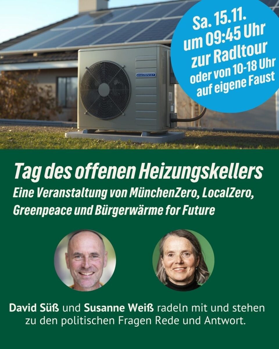 Dieser Tag ist eine Veranstaltung von MünchenZero, LocalZero, Greenpeace München und Bürgerwärme for Future und ermöglicht es, mit Menschen zu sprechen, die innovative und klimafreundliche Heizungen bei sich eingebaut haben. Dazu laden sie uns in ihren Heizungskeller ein und wir können aus erster Hand Chancen und Herausforderungen kennenlernen.